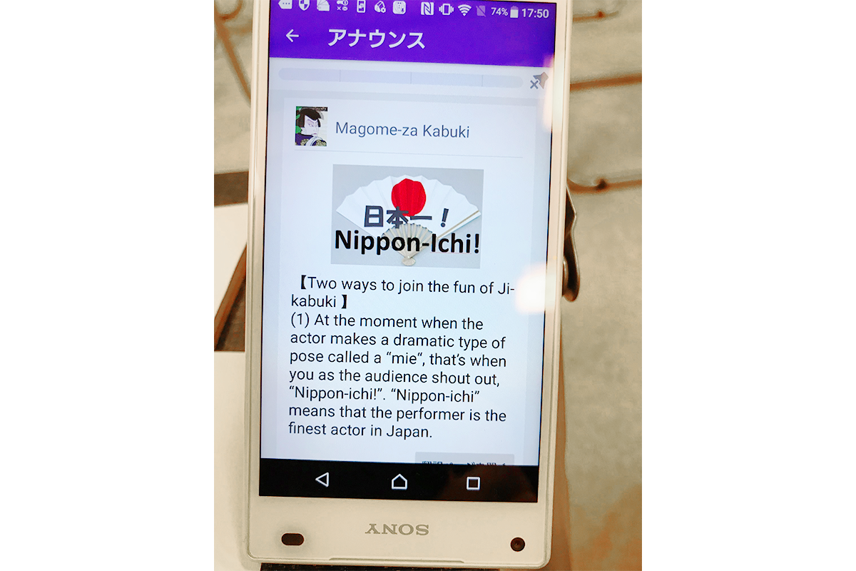 会場となった馬籠座歌舞伎は、70人程度が着座で入れます。実証実験は、「おもてなしガイド」をインストールしたスマートフォンを来場した外国人観光客に貸し出し、地歌舞伎のセリフや場面、劇の背景、要約などの解説を、多言語でシーンに応じて表示するという形で実施しました。開演前には、トイレや写真撮影についての説明、それに「大向こう」や「おひねりの投げ方」など、地歌舞伎の楽しみ方の説明も提示しました。