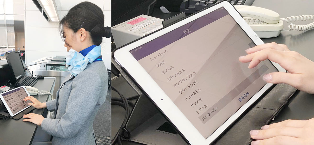 現在、当社は国内50空港の全旅客係員にタブレット端末を貸与し、出発搭乗口にて「おもてなしガイド」のサービスを提供しています。「おもてなしガイド」を導入することにより、必要な情報をタイムリーにお届けできると考えました。
